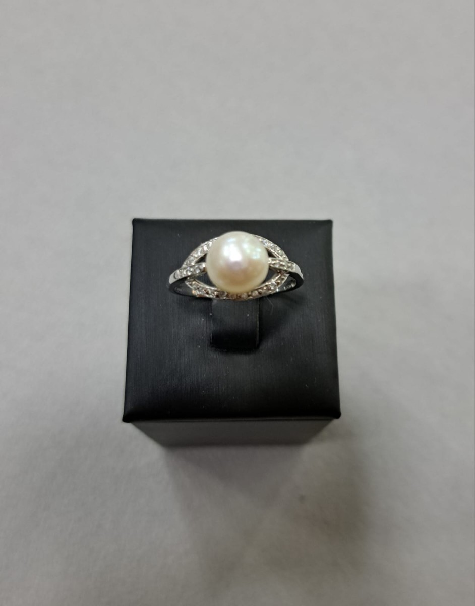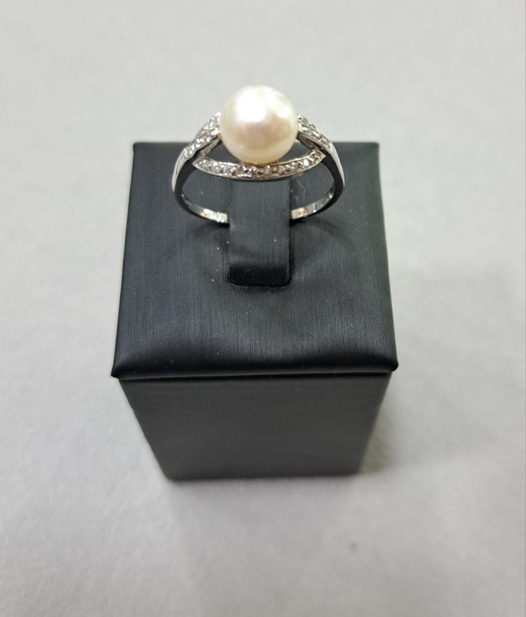 Anello perla in oro bianco 18kt con zirconi.