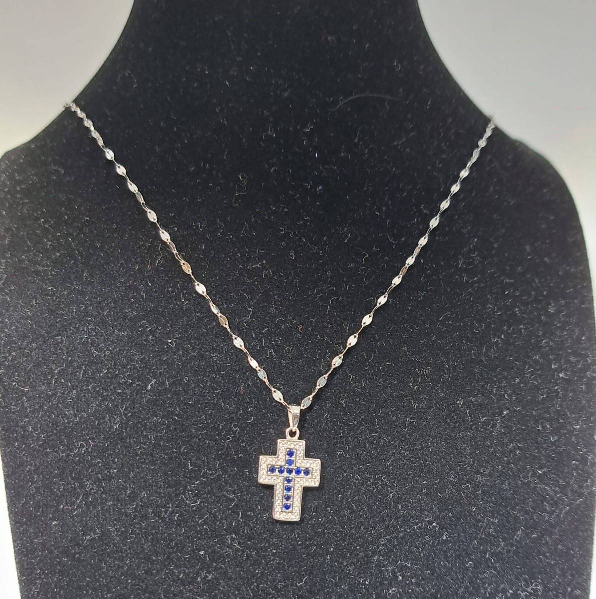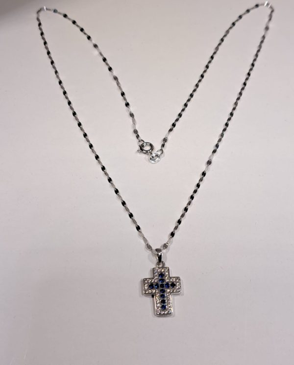 Collana con pendente a forma di croce in oro bianco 18kt con zirconi blu e bianchi.