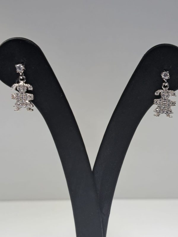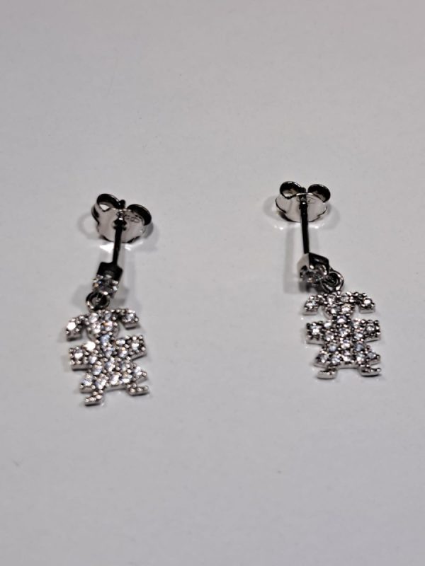 Orecchini in oro bianco 18kt con zirconi, con pendente a forma di bimba.